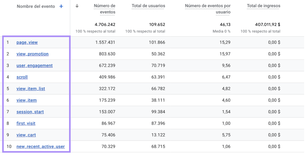 Ahora verás una lista de todos los eventos de los que se ha realizado un seguimiento en Google Analytics.