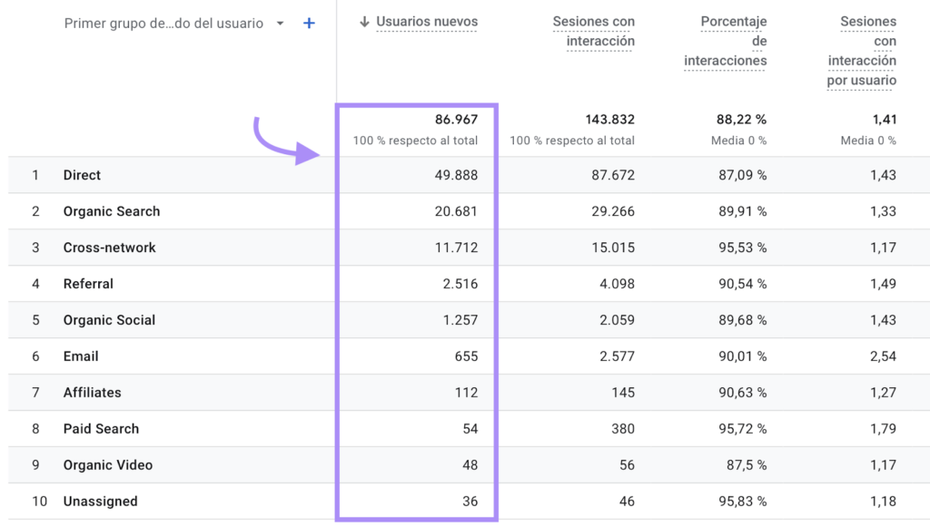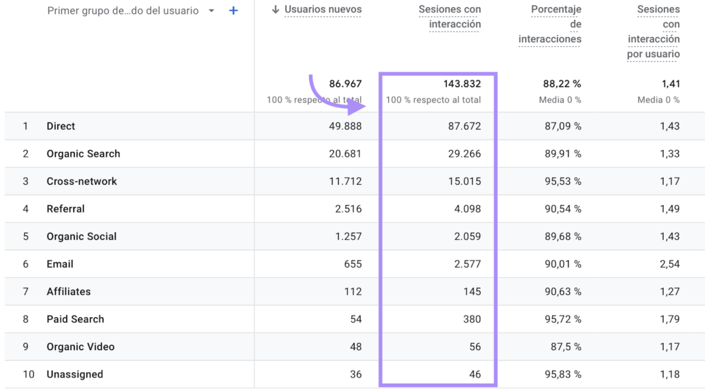 La siguiente tabla de datos parciales muestra una propiedad de Google Analytics que tuvo 143.832 sesiones durante el período de tiempo especificado.