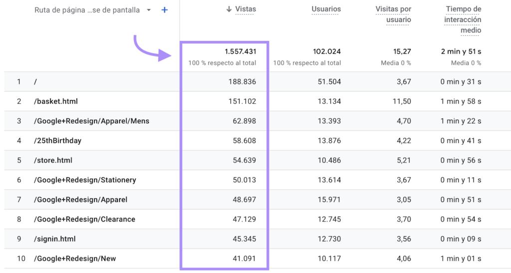 Aquí puedes ver una tabla de datos que contiene una lista de las páginas principales por visitas.
